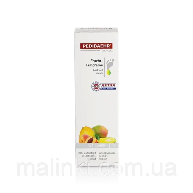 Фруктовий крем для ніг з цінними маслами (манго, авокадо, зливу та персик), вітамінами (А, Е та D) та мікроелементами насичує шкіру поживними речовинами. Сприяє усуненню сухості та зроговінь за рахунок гіалуронової кислоти та 5%-ної сечовини.